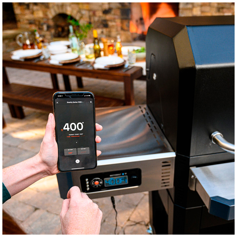 Digital charcoal grill and smoker with 1050 square inches of cooking space Reaches 225˚F in 8 minutes or 700˚F in 15 minutes to use as traditional charcoal grill or charcoal smoker DigitalFan™ precisely maintains desired cooking temperature during grilling or smoking GravityFed vertical charcoal hopper uses gravity to continually burn through fuel, allowing for 10lbs of lump charcoal or 16lbs of briquettes for up to 8 hours of use Digital control panel to easily set desired cooking temperature for grilling or smoking Control your Gravity Series Charcoal Grill with the Masterbuilt app to set and adjust temperature and time, monitor meat probes, or shut down your grill conveniently from your mobile device Includes reversible cast iron grates for high heat searing or low and slow smoking methods Stainless steel front and side shelf for additional food preparation space Two porcelain-coated warming racks to keep food warm during cook Built-in temperature gauge and meat probe thermometer for perfect results every time Includes 1 year warranty