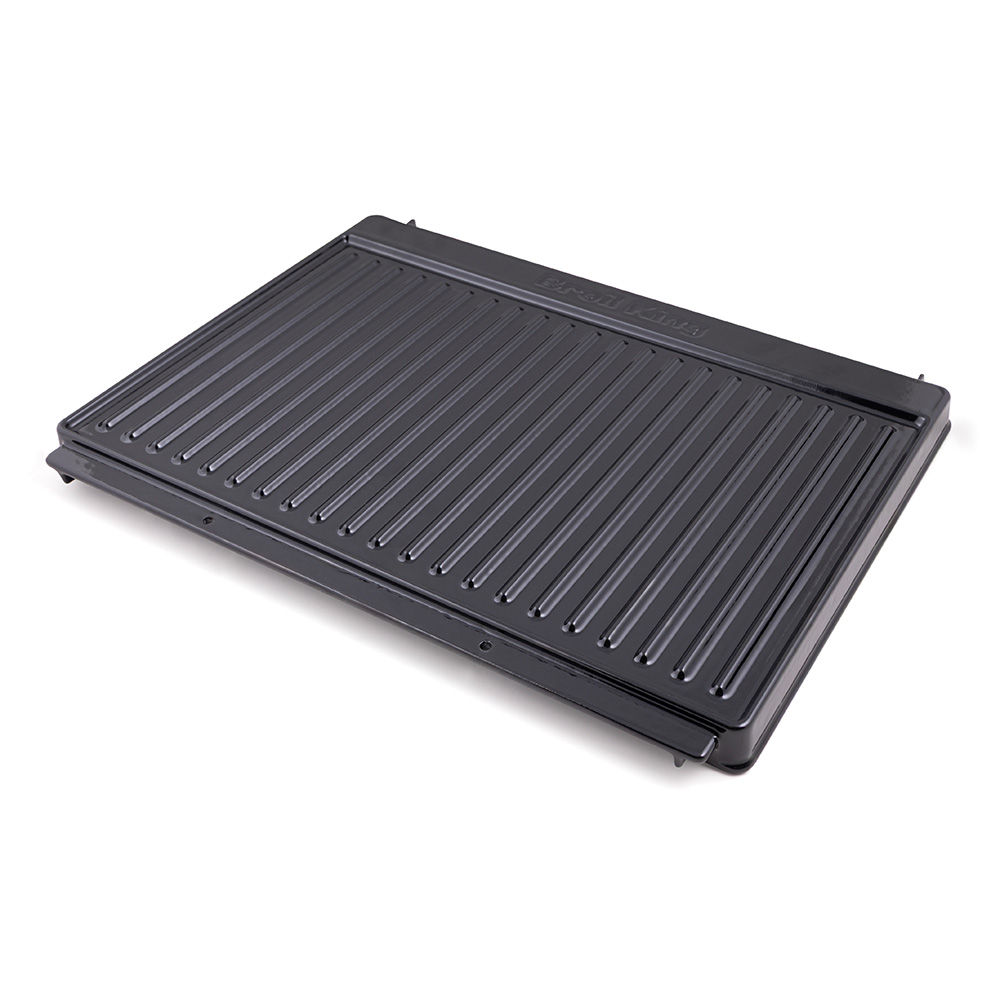 A heavy-duty, double-sided cast iron griddle with a fine porcelain coating. One side is smooth for frying, while the other side is ribbed for grilling. Designed to fit perfectly inside the barbecue, replacing 1 piece of the cooking grids on Broil King Monarch & Royal models.