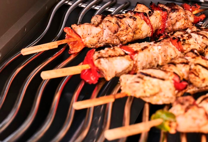 - Σουβλάκια κοτόπουλο: κομμάτια κοτόπουλου, πιπεριές, κρεμμύδια όλα περασμένα στα καλαμάκια. Μαρινάδα από λεμόνι, ελαιόλαδο, μουστάρδα, ρίγανη. Ψήσιμο σε δυνατή φωτιά, 8–12 λεπτά, γυρνώντας συχνά.